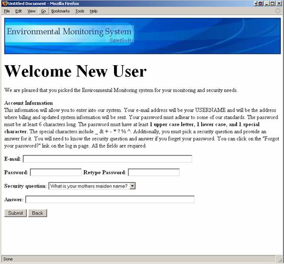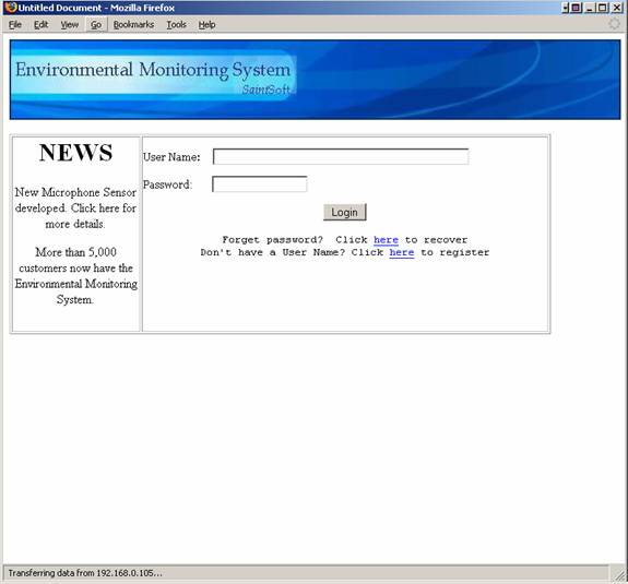 The Login Screen is the first screen that a user is faced with upon access to the system.  This screen contains a section in which current news is displayed.  Such news could include upgrades to the system, new sensors available to users or a simple system status.  The screen also contains two entry fields.  The first field is for the user name, the second for the user’s password.  Upon correctly completing the specified information, the user is then directed to the corresponding user welcome screen.  The initial login screen also provides the user with two links.  The first link allows the user to retrieve a lost password.  Upon clicking the link, the user is directed to the password recover screen.  The second link allows a new user to create a new account and when clicked, directs the user to the first register screen.