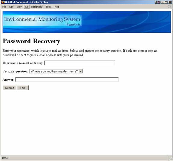 If the user forgets their password then they can enter their use name, a security question, and the answer to that security question and the user password will be sent to the e-mail address they provided during registration.  The pop-up appears when the submit button is pressed.