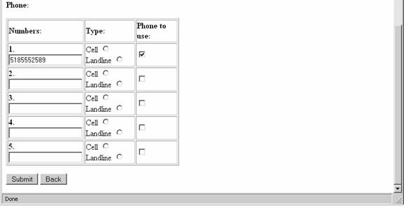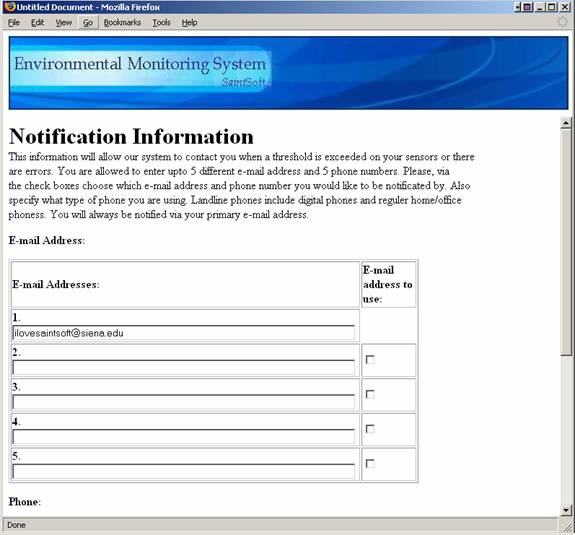 This is the final registration screen.  The user can enter up to five e-mail address and five phone numbers.  These e-mail address and phone numbers will be used to contact the user in the case of an alert or notification.