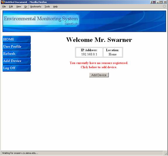 This screen is the initial screen a user will see when first logged in.  The users IP address and location of the computer will be displayed along with a warning that there are no sensors registered.  The user can change the user profile and add a device from here.