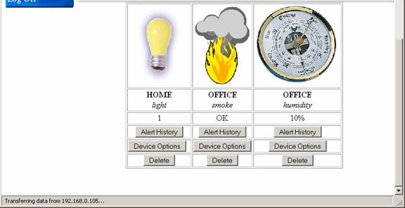 This page appears when a remote users logs in.  The remote user is able to view the alert history and the information provided by the sensors.  The remote user can add a device and view the machines IP address and location.