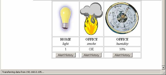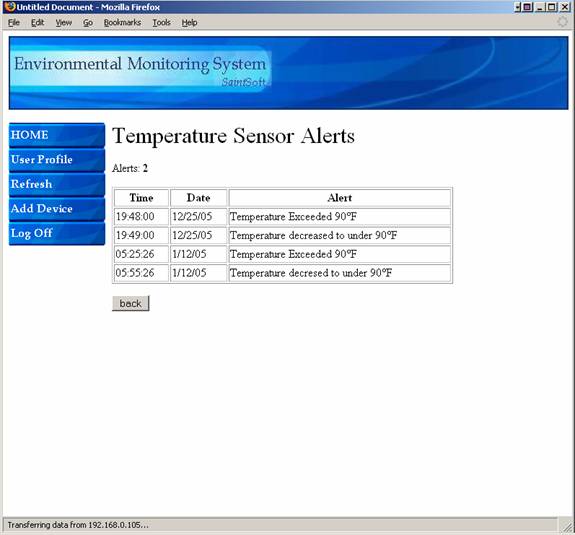 When the user-view the alert history this page appears.  The time, date and nature of the alert are displayed.  Clicking back will bring the user back to the main page.
