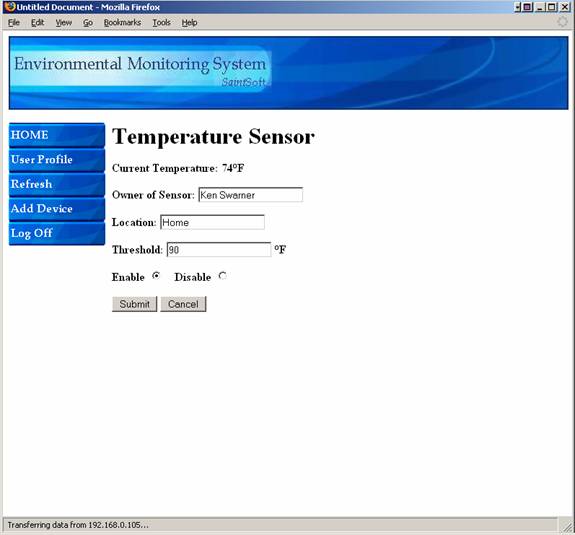 When the device options button is pressed this screen appears.  The owner of the sensor, the location and the threshold for the certain sensor can be changed.  The user can also enable and disable the sensor if need be.