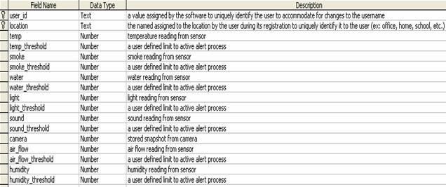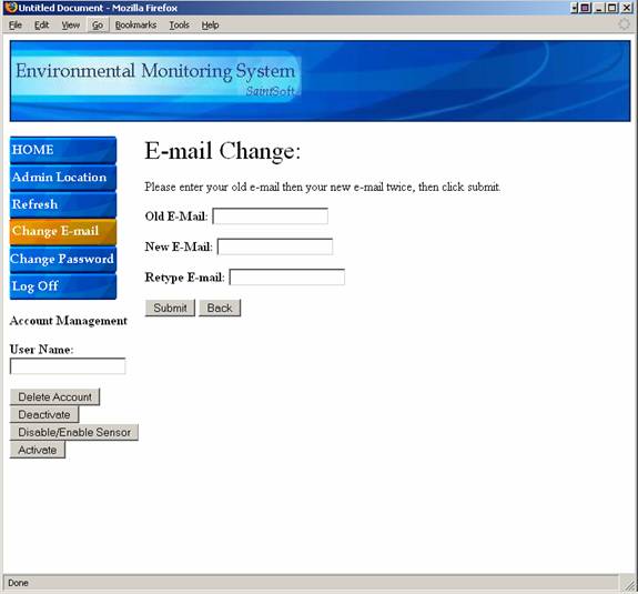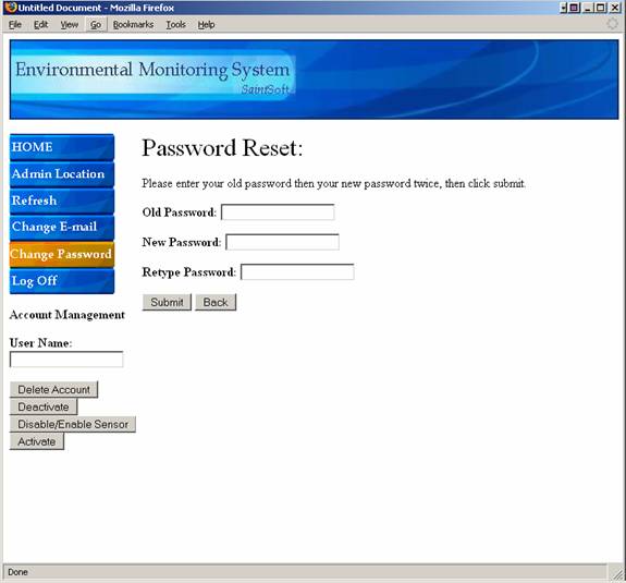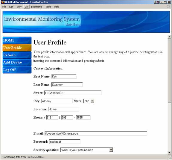 From this point on, the user is provided with five different buttons that appear on the left side bar of the screen.  The first of these five buttons entitled “Home” will direct the user to their initial welcome screen.  The second button, “User Profile”, will direct them to the User Profile Screen in which the user can view and change personal information.  The third button, “Refresh”, will refresh the users current page, updating any displayed sensor information.  The fourth button, “Add Device”, will direct the user to the Register Sensors Screen, allowing the user to add a new sensor to the account from the computer in which they are located.  The fifth and final button, “Log Off” will log the user out of the system and direct them to the Login Screen.