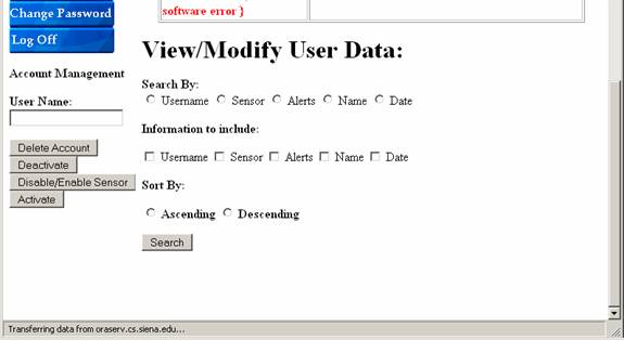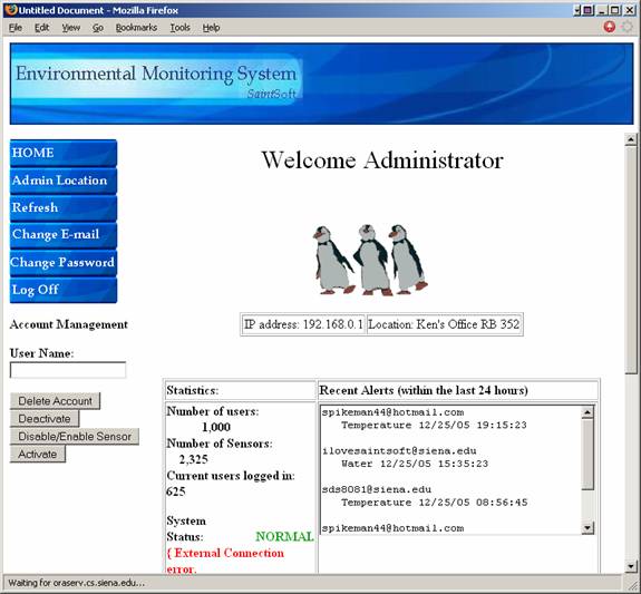 When the administrator logs in this is the screen that appears.  From here the admin can view the IP address and location of the machine being used.  The admin can also view some statistics of the system along with the most recent alerts and the system status.  The admin can change the admin location, e-mail and password by clicking the buttons to the left.  The admin can query the user database by specified fields at the bottom.  Finally the admin can delete, disable, activate and disable/enable sensors by using the buttons on the left.