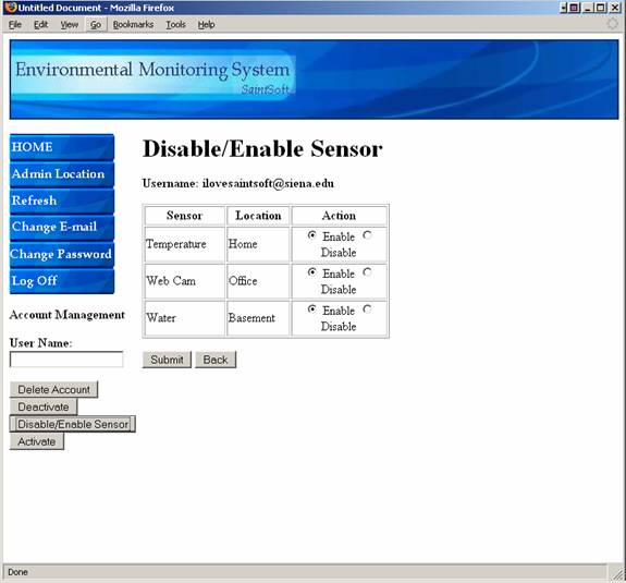Admin clicks the Disable/Enable button and is brought to the Disable/Enable Sensor Screen