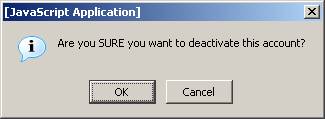 A message box is displayed confirming that the Admin wants to deactivate an account.  Account is deactivated