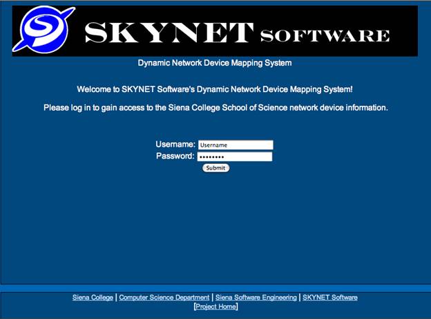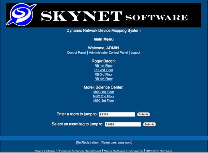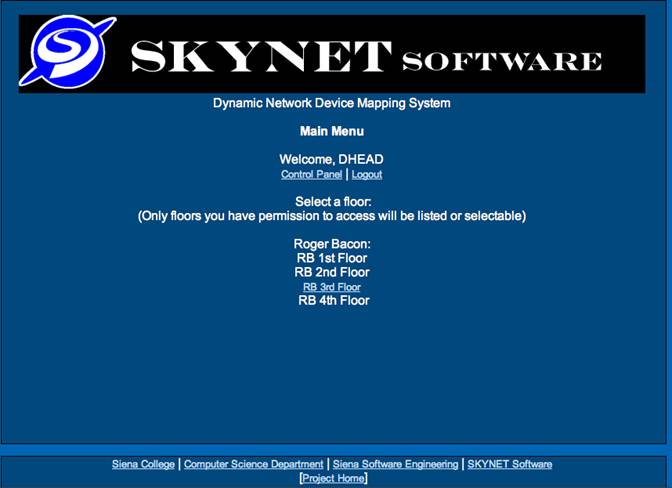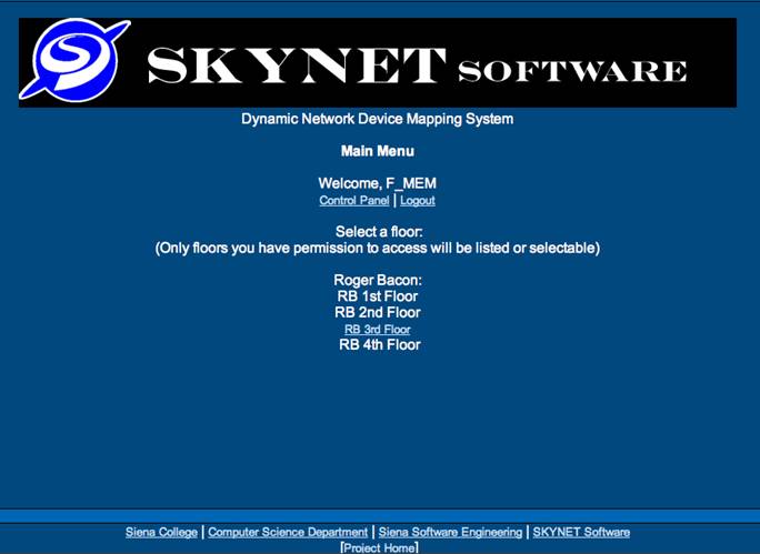 The main menu page contains hyperlinks to each of the available floors based on the logged-in user's permissions. The user can also follow a hyperlink to the Siena College website, the Siena College Computer Science Department website, the Software Engineering website, SKYNET Software's website, or the project website.