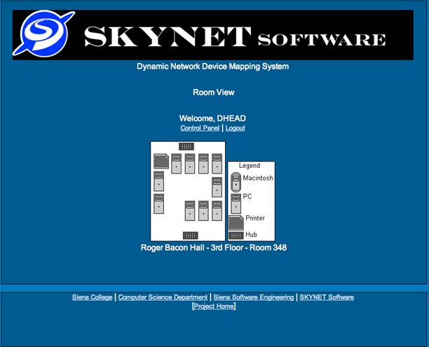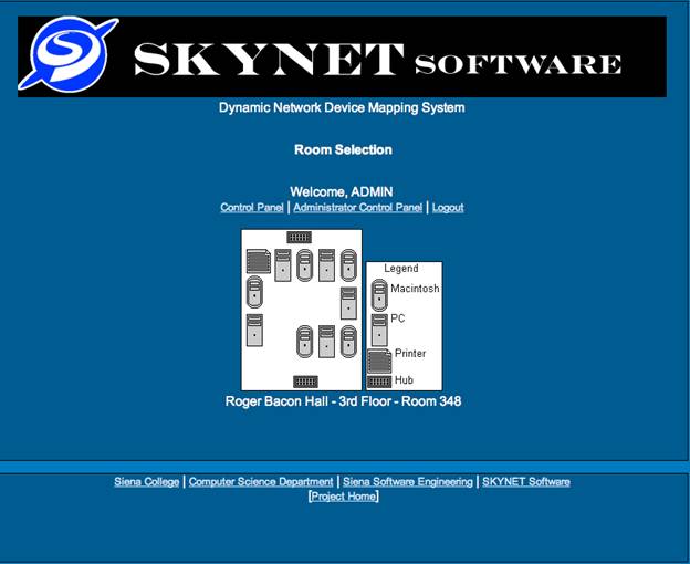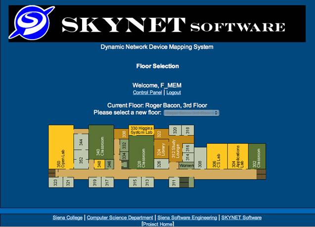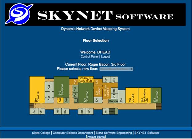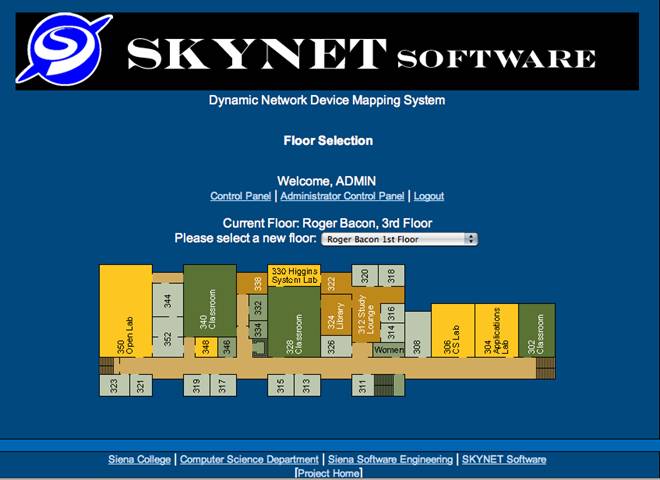 The floor plan page will allow the user access to all floors available to them by use of the drop-down menu. The user can click on any rooms within their permission set to load the "room view" page. The user can also follow a hyperlink to the Siena College website, the Siena College Computer Science Department website, the Software Engineering website, SKYNET Software's website, or the project website.