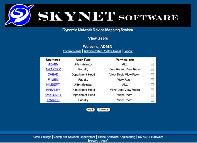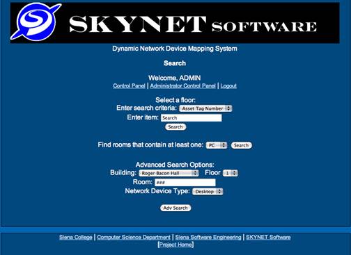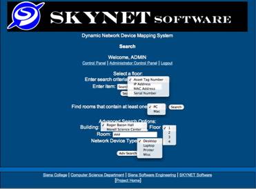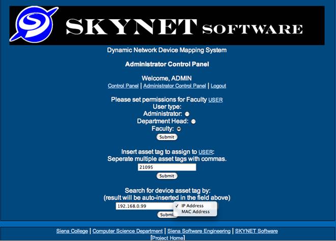 The Administrator control panel allows an administrator to set permissions for any user by choosing if they are an administrator, faculty member, or department head. This page will also allow the administrator to assign one or multiple devices to a user by inputting the device's asset tag. The asset tag for any device can be retrieved from this page also by searching by IP or MAC Address. The user can also follow a hyperlink to the Siena College website, the Siena College Computer Science Department website, the Software Engineering website, SKYNET Software's website, or the project website.